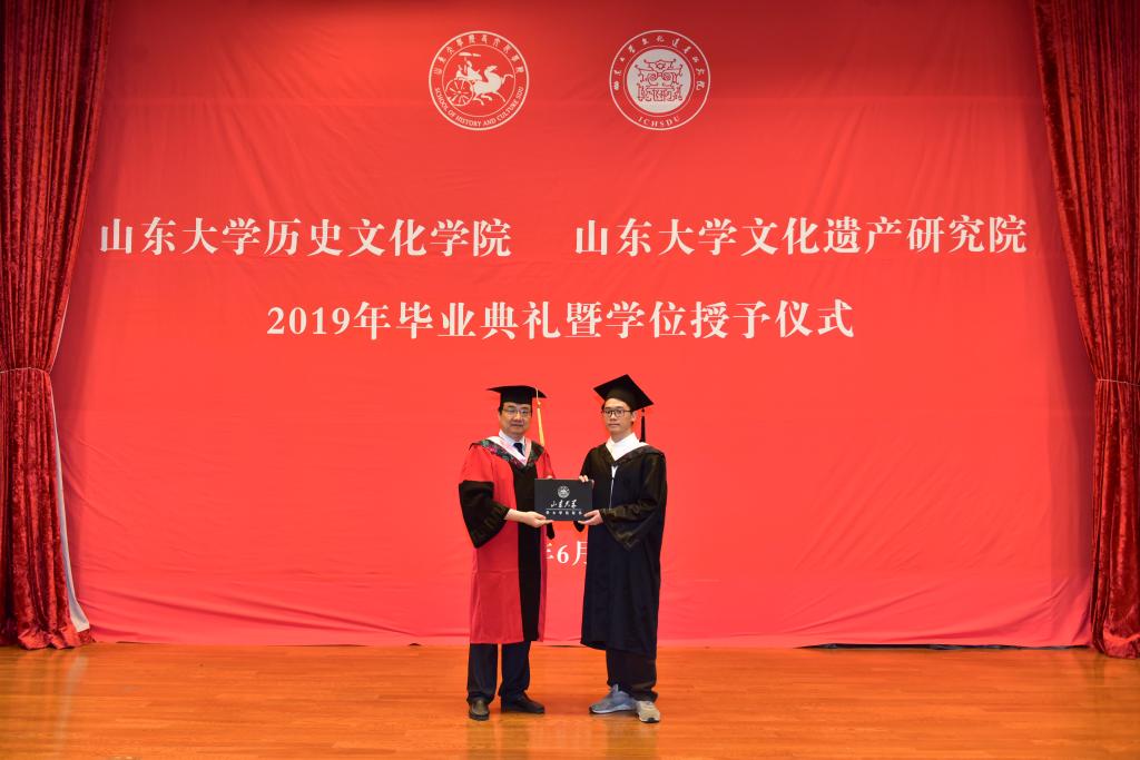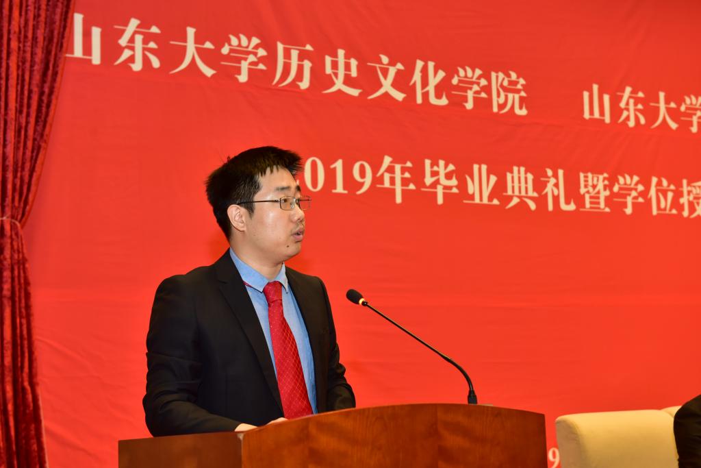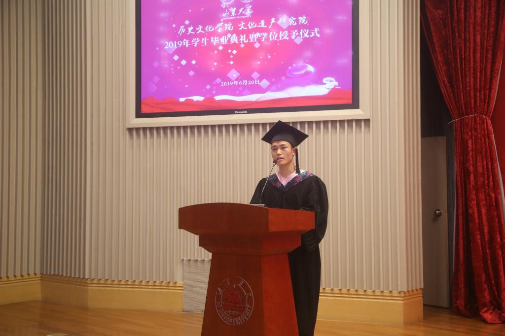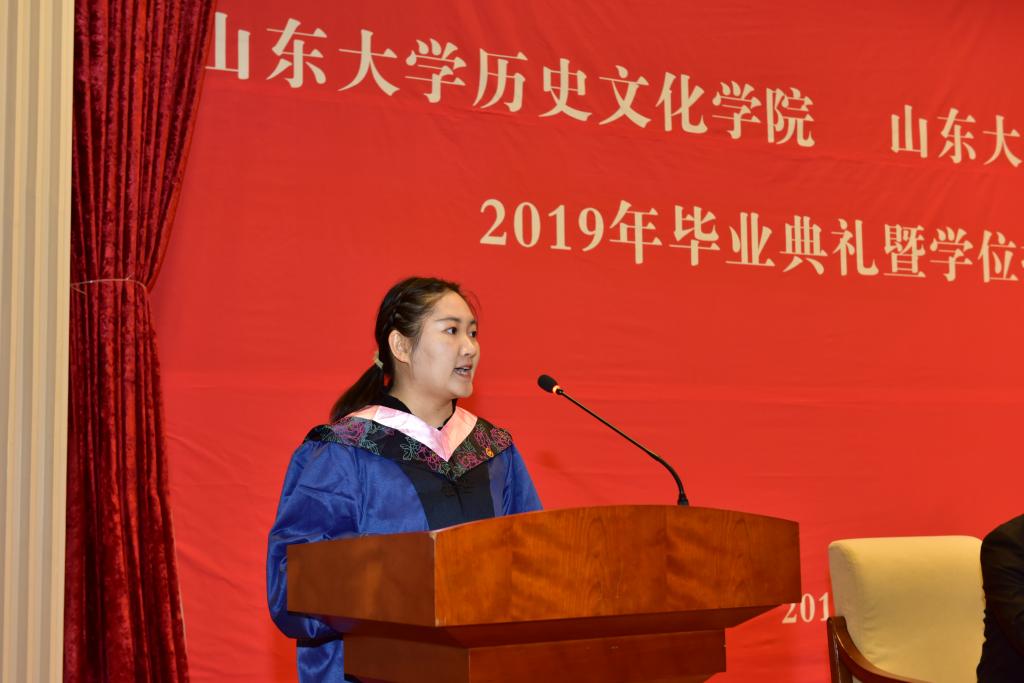 毕业生代表、2015级历史学专业本科生赵显锋同学和2016级文化产业管理专业硕士研究生周恋榕同学分别发言。他们回顾了大学的美好时光,感恩师长们的悉心培养,对公司优良的育人传统致以敬意。临别之际,他们对校园里一草一木深怀眷恋,祝愿公司“人才济济,再书华章”,祝愿恩师们“身体健康,桃李芬芳”,祝愿师弟师妹“珍惜年华,茁壮成长”;同时决心胸怀高远的人生格局,带着山大历史人的天下情怀,勉励彼此在奋斗报国路上“梦想常青,担当常在”。
