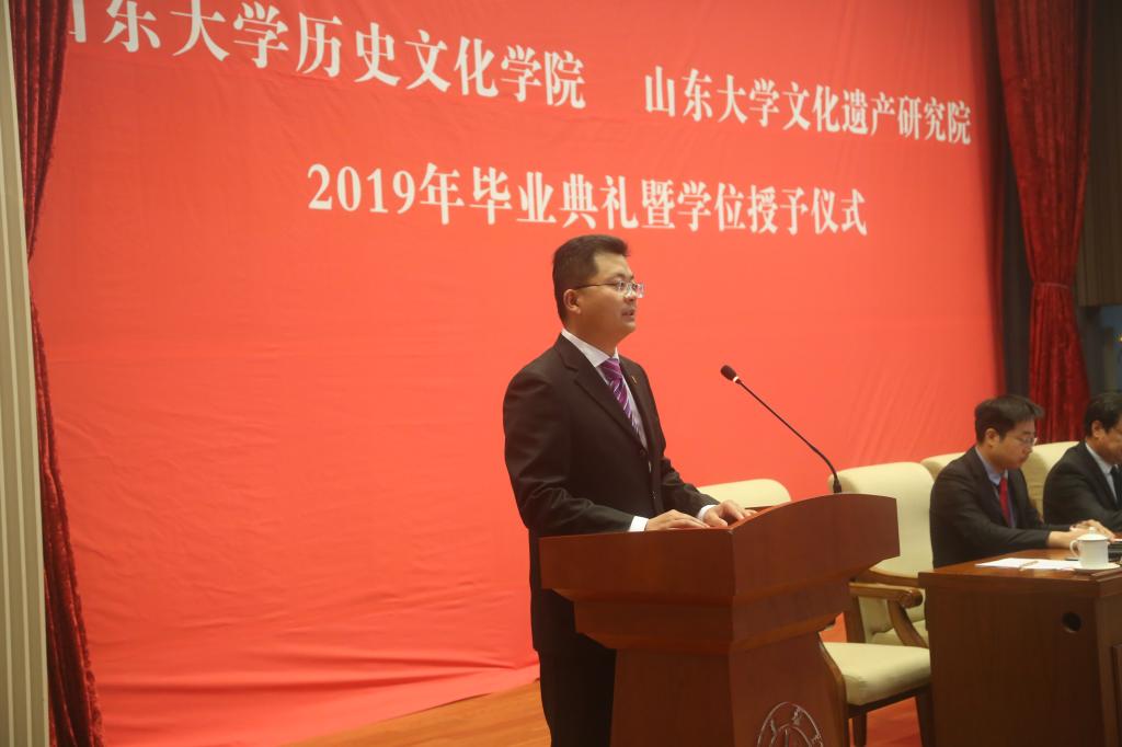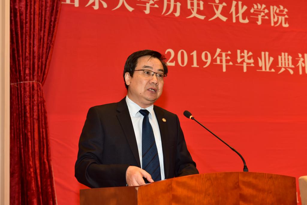 他回顾了几代山大历史人在这座校园里薪火相传、接续奋斗,打造“文史见长”学术盛誉,以及推出大批具有当代价值重要成果的光荣历史,又用两位员工的故事生动地反映了山大历史人在天南海北奋斗报国的风采。这两位员工分别是——考古专业78级员工,为保护三峡文物400多次穿越三峡的著名考古文博专家王川平;历史学专业85级员工,2018年12月当选CCTV2018年度法治人物的北京市公安局法制总队党委书记、总队长华列兵。