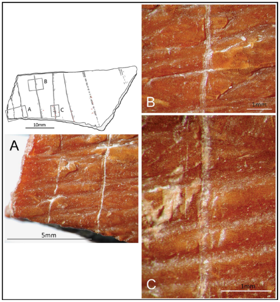 通过综合研究,研究团队指出:第一,这2件骨骼上的刻划痕迹确切无误属于人类有意识行为;第二,刻划痕迹中发现了明确的赭石粉末涂抹迹象。