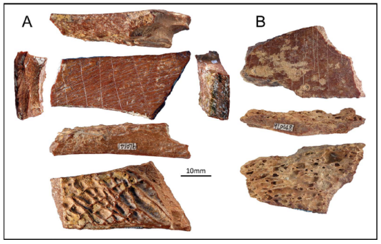 通过对遗址出土的30000多片动物骨骼科学分析,发现有2件标本上面有人工雕刻痕迹。随后研究团队对这2件标本进行了扫描电镜分析、拉曼光谱分析、能谱分析以及模拟实验研究。