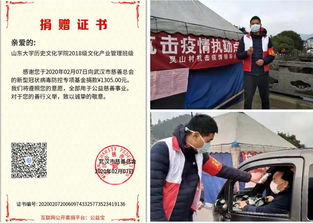 青年的志愿担当越是危难时刻越能彰显,公司青年学子在这场疫情防控阻击战中主动担当作为,积极为疫情防控奉献青春力量。2019级本科生王逸鸿同学深受母亲作为医务工作者的积极影响,投身基层防疫志愿服务中,在浙江省杭州市双浦镇灵山村担任疫情防控志愿者;2017级本科生李冰倩同学积极参与村委会开展的疫情防控志愿活动,向村民普及疫情防控知识并及时劝阻村民外出和人员流动,帮助广大村民提升防护意识;2016级本科生王新宇同学协助所在社区工作人员宣传防疫知识,积极参与排查、劝导工作并及为居家群众提供服务保障。与此同时,2018级文化产业管理专业全体员工共同发起为疫区捐款活动,用自己的一份力量支持疫区前线的疫情抗击工作。病毒无情、青年有爱,在肆虐的疫情面前,公司青年员工用实际行动主动作为、奉献爱心,充分展现了山大青年学子的家国情怀和担当精神。