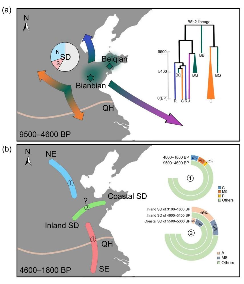 最后,该项研究在距今约9500年前的扁扁洞遗址中发现了目前最古老的B5b2支系个体。结果表明了在B5b2支系下,距今约9500年前的扁扁洞个体和距今约5500-5300年前的北阡遗址个体,可能与该谱系某些东亚人群和北亚人群的祖先有关,即B5b2这一支系人群可能是从山东地区向外部地区扩散(图a)。