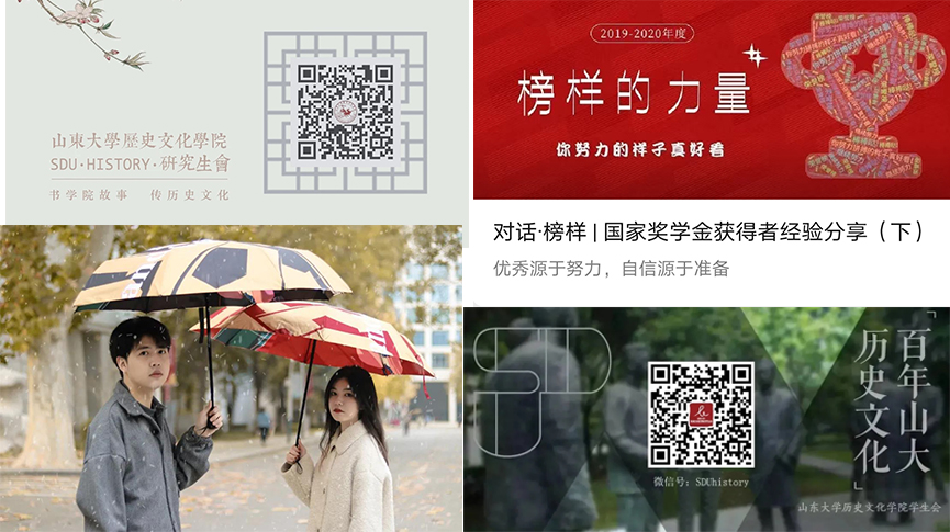 在新媒体和特色建设方面,院员工会公众号开辟“闪光的你”“对话·榜样”等模范宣传板块,以优秀促优秀;推出“百年百廿”专栏,打造党史、校史学习云平台。上一年度,员工会公众平台关注用户近4000人,推送消息300余条,总阅读次数超170000次,单日最高阅读次数近4000次,所有数据均创历史新高。院研究生会公众号“SDU·HISTORY·研究生会”把握各专业的共性与特点,兼顾员工需求和发展方向,优化微信推送的板块结构,形成了由“闻道”“百家”“新书推介”“期刊资讯”等组成的服务学术的板块和由“招聘”“帮推”“全心权益”“节气”等组成的服务员工的形式,并且在推送中积极进行原创选题制作。自2020年7月至今,共计推文425篇,总阅读量超过150000次。此外,院研究生会结合专业特色,建立公司文创周边设计体系,目前已设计并生产出帆布包、渔夫帽、马克杯、围巾、“历史文化”厚款绷带笔记本、公司猫笔记本、公司猫钥匙扣、公司猫晴雨伞等文创产品,受到公司老师和同学们的一致好评,并得到《大众日报》专题报道。