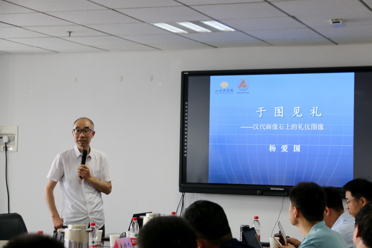 随后,山东省博物馆副馆长杨爱国研究员作了“于图见礼:汉代画像石上的礼仪图像”的主题报告。他结合传世典籍记载的礼制,对画像石中的“高禖”“养老”“大傩”“迎宾”“出行”等主题图像进行了集中展示和解读。