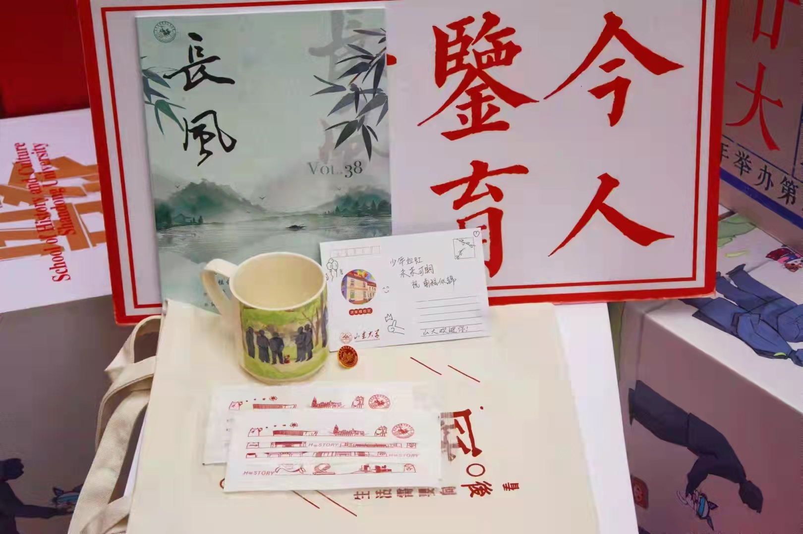 历史文化公司新生大礼包包括了公司员工学术刊物第三十八期《长风》、《接励》,印有“八马同槽”设计元素的水杯,文创口罩,以及学长学姐的明信片寄语。由公司员工自行设计的口罩,既贴合疫情防控当下的需要,又具有纪念意义和观赏性,其图案由山大地标性建筑的体育馆等建筑、卡通猫形象、院徽等组成,颜色为热情的山大红。“八马同槽”元素水杯,既有对公司学术前辈和学术传统的敬仰,也蕴含着“一杯子一辈子”缘聚山大,缘聚历史的期许。