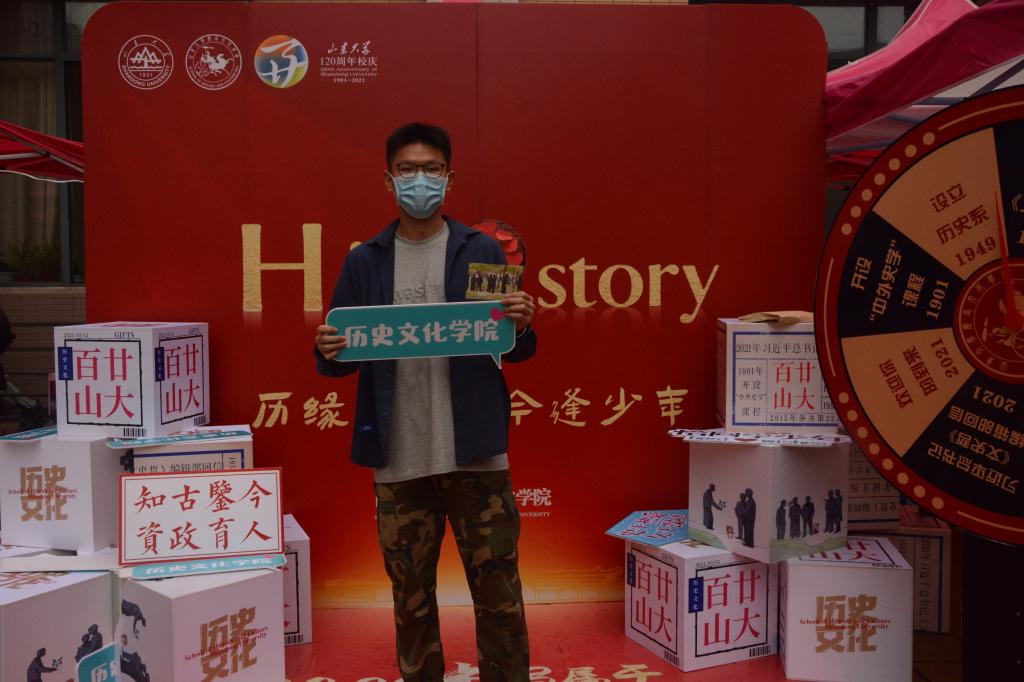 迎新报到处设置转盘抽奖环节,使新生报到更添一份幸运和期待。转盘的设计也别具匠心,小小一方转盘也是一本自历史系设立72年来历史文化公司的大事记,转盘每一分隔分别书写有“1951年创办《文史哲》”、“1996年组建历史文化公司”、“2015年举办第22届国际历史科学大会”、“2021年习近平总书记给《文史哲》编辑部回信”等内容,同时也有一格写有“2021 欢迎你的到来”,希望每一位新生也在手拨转盘中阅读历史,翻涌出新。