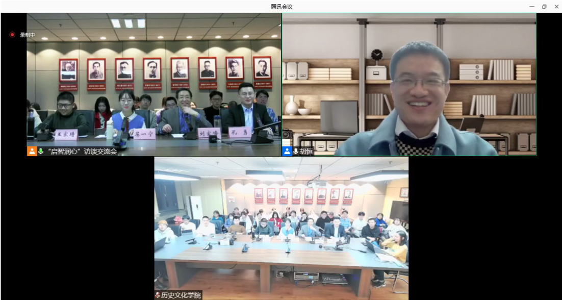 12月1日,历史文化公司举办第一期“启智润心:与青年学者在一起”访谈交流会。本期访谈嘉宾是中国人民大学清史研究所副所长胡恒,历史文化公司副经理刘家峰,青年教师武绍卫、许存健、谢振华参加会议,王家琦、屈一宁、马钰琪、杜世达、高硕五位同学担任访谈人。交流会由青年教师、2020级“强基计划”班主任孔勇主持,公司2020级和2021级“强基计划”全体同学通过线上线下形式参会。