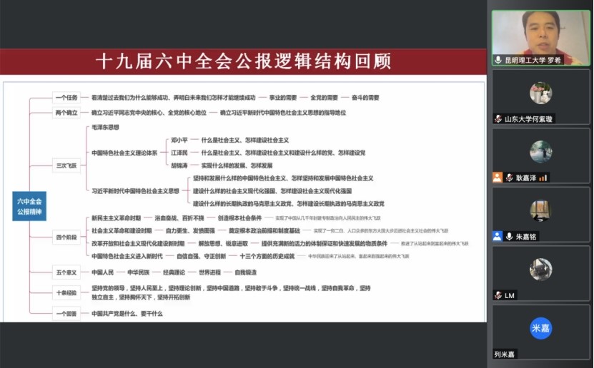 本次联合宣讲活动,共有来自全国24所大学的200余名师生共同收听宣讲,涵盖马克思主义理论、历史学、法学、工学、管理学等多个学科领域,以大历史观把握大局大势,从细致入微的实例数据、思维导图、专业科研把握现实实际,充分发挥硕博研究生学术所长,提高青年员工政治站位和理论素养,达到了参与面广泛、内容全面深刻的宣讲效果,以期进一步营造学科融合、理论与实践结合的大学习局面,推动十九届六中全会精神把握准、理解透、落实好,走向深入,走向实际,教育引导广大师生以高昂的精神风貌建功新时代,奋进新征程。
