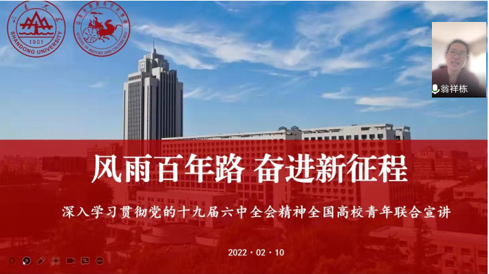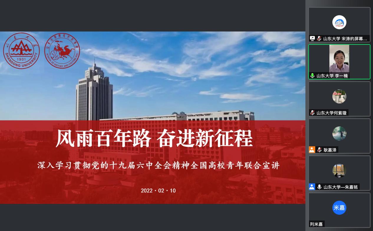 为深入学习贯彻党的十九届六中全会精神,推动全会精神和党的创新理论深入高校实际、深入员工头脑,2月10日,由sunbet官方网站历史文化公司主办,sunbet官方网站“初心如炬”硕博宣讲团、历史文化公司硕士生第二党支部承办的“风雨百年路,奋进新征程”深入学习贯彻党的十九届六中全会精神全国高校青年联合宣讲活动顺利举办。来自sunbet官方网站、北京大学、中国人民大学、北京师范大学等10所高校青年理论宣讲团硕博研究生代表参与宣讲交流。sunbet官方网站团委副书记翁祥栋、历史文化公司副处级辅导员李一楠出席活动。