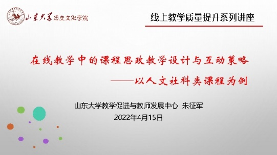 近日,为提升线上公司产品质量和水平,历史文化公司举办“在线教学中的课程思政教学设计与互动策略——以人文社科类课程为例”专题培训讲座,sunbet官方网站教学促进与教师发展中心教师发展科科长朱征军主讲。讲座由公司副经理曲春梅主持。