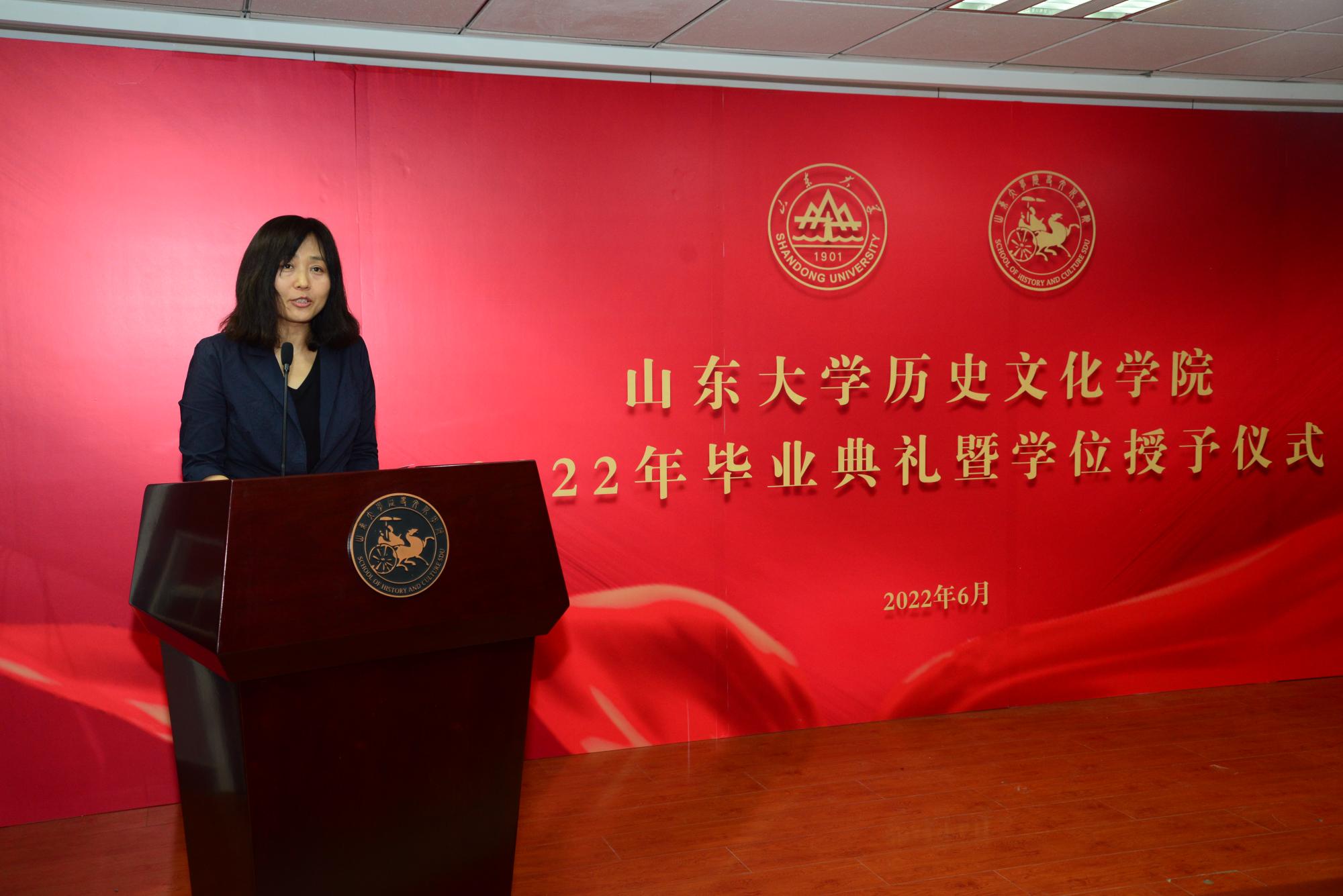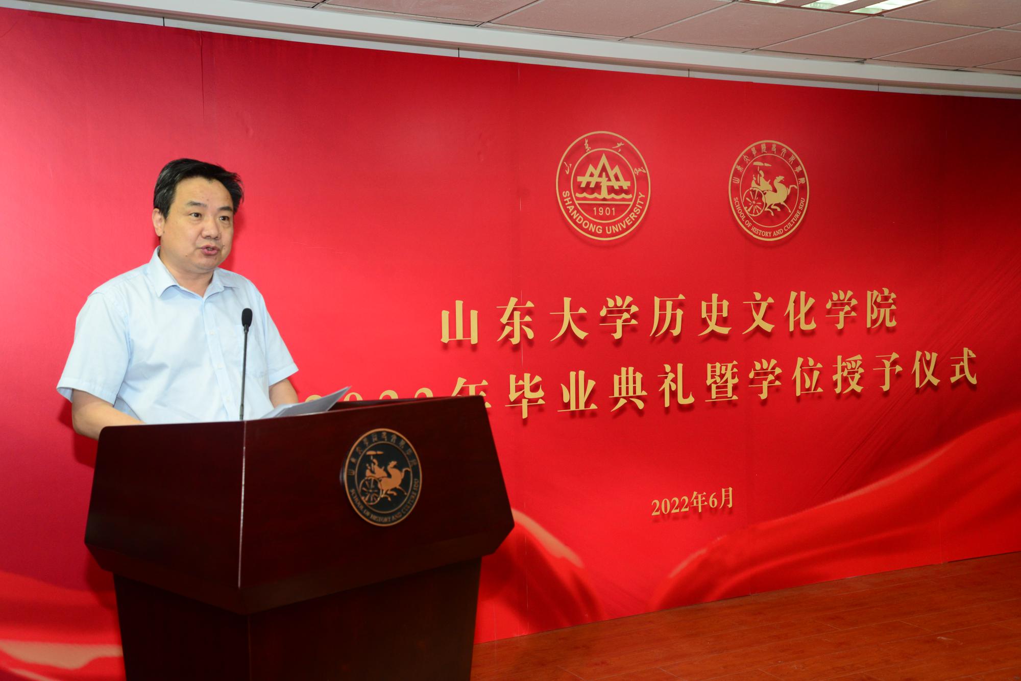 教师代表刘家峰表达了对同学们学有所成、顺利毕业的祝贺。发言中,他回顾了自身的求学经历和学术历程,讲述了山大历史学科的变迁和发展。他提到,希望所有毕业生重视反思的价值,保持谦逊的态度,保有坚韧、坚持、专注的精神,要肯定在大学学习阶段所取得的进步,永葆山大人的精神品格。发言语重心长、情真意切,他期待毕业生们未来都能做热心帮助他人,做能独立思考、平等待人而又谦卑的人,用自己的生命去影响更多的生命,在奋斗中成就精彩人生。