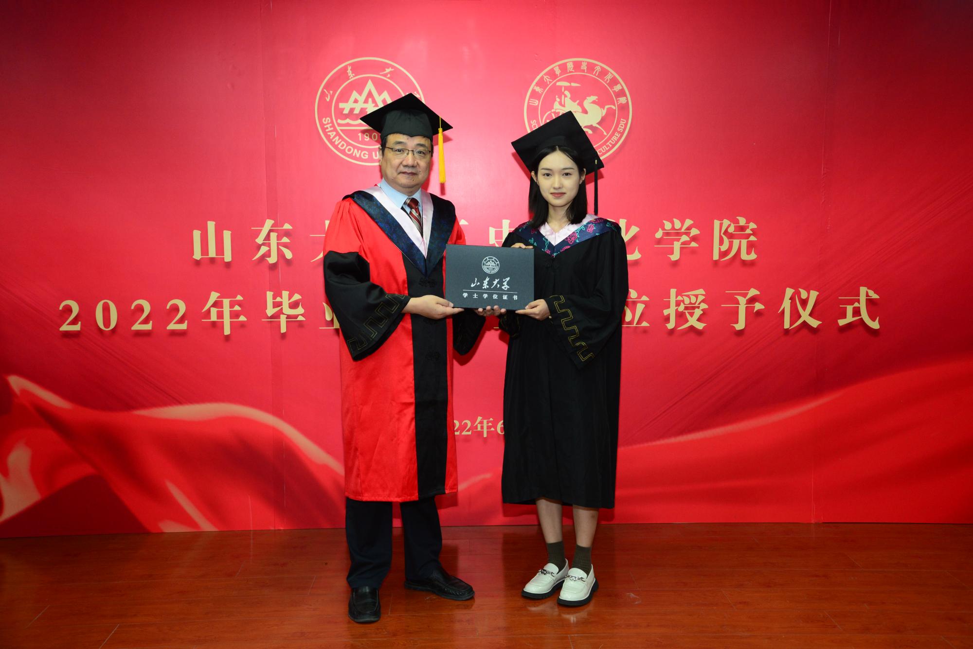 典礼在庄严的国歌声中拉开帷幕。李功华宣读《sunbet官方网站关于表彰2022届优秀毕业生的决定》,刘军为获评“山东省优秀毕业生”荣誉称号的毕业生代表颁发证书。