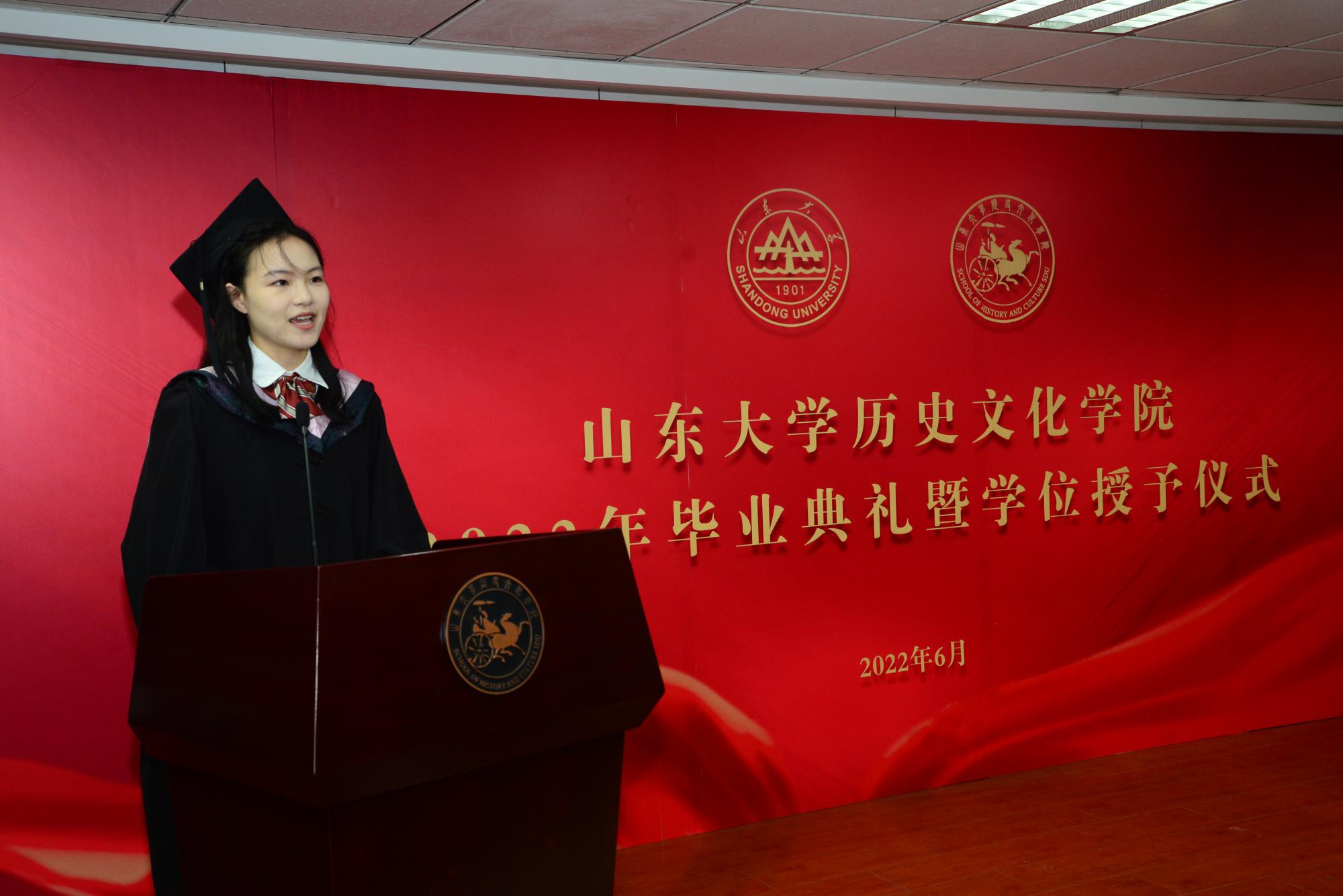 毕业生代表2018级考古学专业博士研究生赵星宇表达了对老师、朋友和自己的感谢,抒发了面对未知未来的挑战的勇气,对老师和同学表达了诚挚感谢和美好祝福。2018级文化产业管理专业本科生丁佳宁回顾了珍贵的求学时光,体悟了教师对员工的滋养与影响,表达了对公司、公司、师长的真挚谢意。两位毕业生代表在发言中都表示要以山大之魂,明爱国之心、励强国之志,自觉担当起时代赋予的历史使命,在时代的舞台上创造出新的历史伟业,不辜负母校的培养与期望。