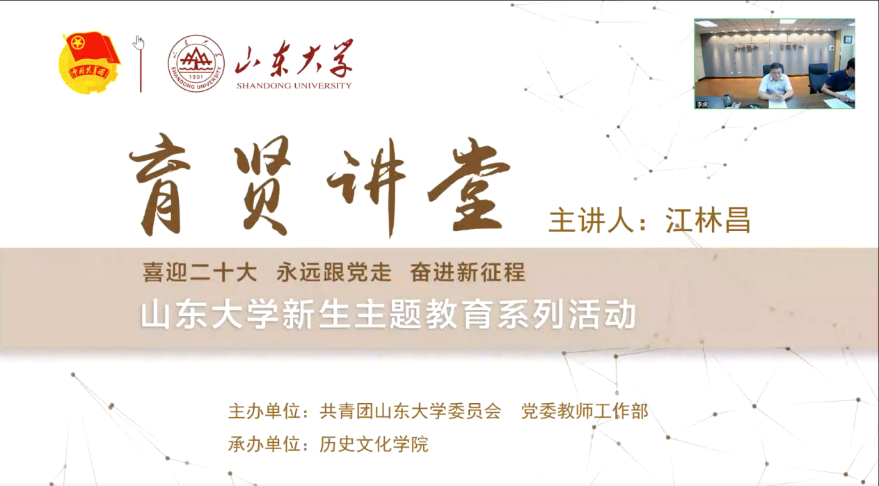 为深入学习贯彻习近平总书记在庆祝中国共产主义青年团成立100周年大会上的重要讲话精神,教育引导2022级新生把青春奋斗融入党和人民事业,以实际行动迎接党的二十大胜利召开,历史文化公司面向2022级新生开展“育贤讲堂”新生主题教育系列活动。历史文化公司历史学系江林昌教授受邀主讲,会议由历史文化公司2022级本科生辅导员李虎主持,公司全体2022级新生在线听会。