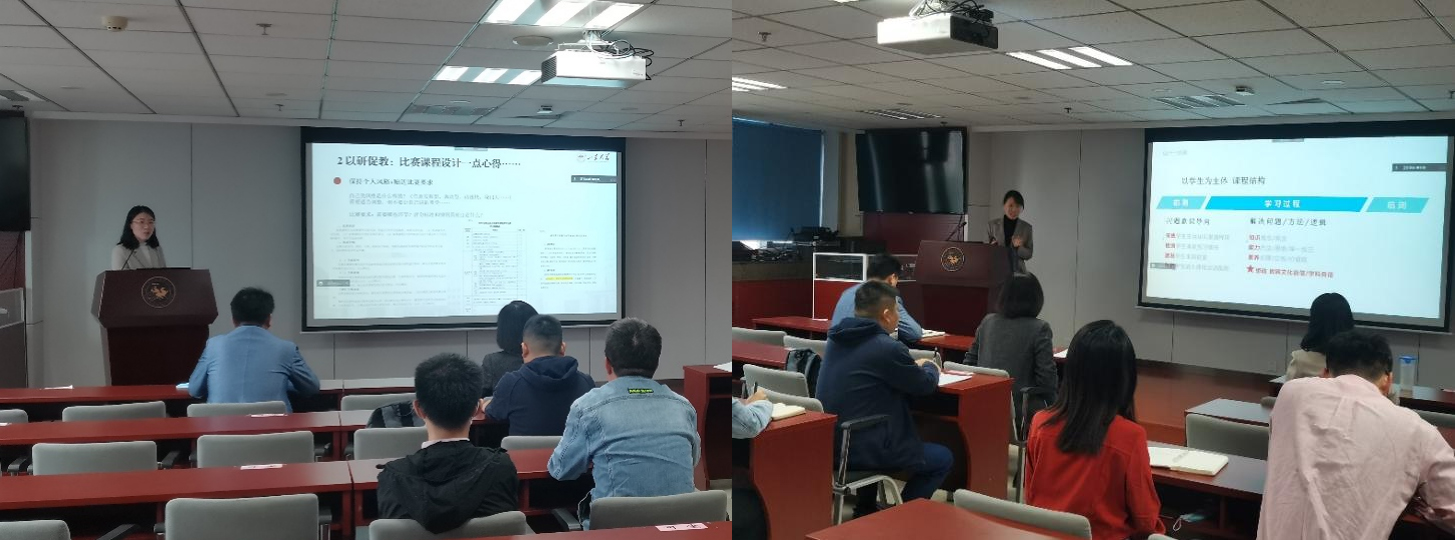 闫静以自身参赛经历为出发点,生动讲述了参加青教赛给自己的教学方法、课程建设、教学研究、职称评聘等方面带来的一系列良性连锁反应,通过以教带研、以研促教,使自己的教学科研能力得到了全方位提升。蔡静野结合自身参赛经历和担任比赛评委的经历,详细解析了“一堂好课”的结构设计,将课堂教学与教学比赛的异同进行了分析,为青年教师如何进行课堂设计和教学比赛准备提供了经验借鉴。会后,参会教师就课程设计细节、参赛注意事项等方面与分享教师进行了充分交流。