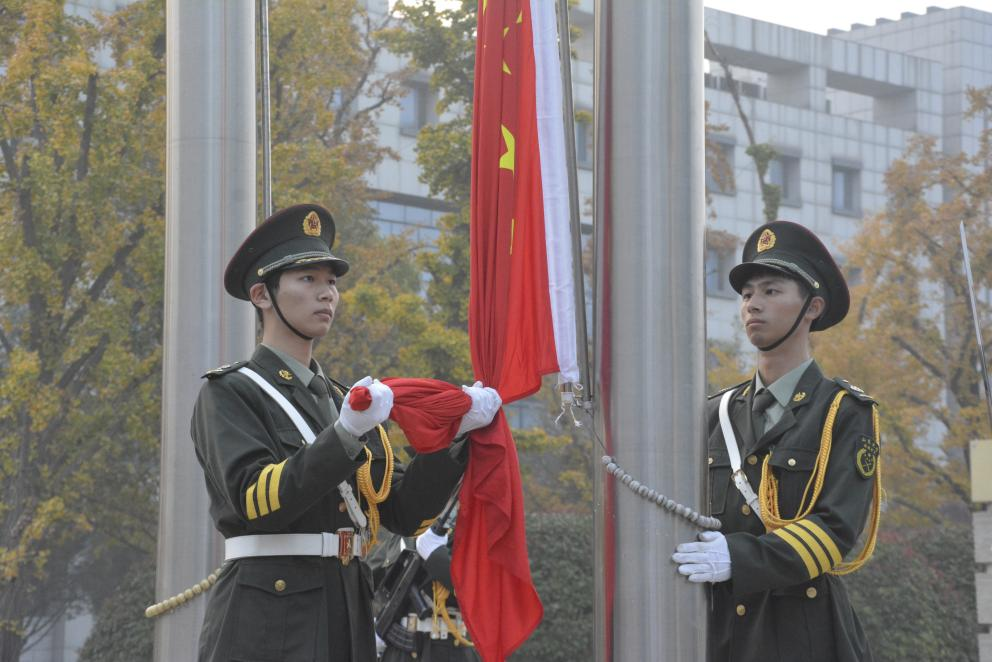 仪式开始,sunbet官方网站国旗护卫队迈着铿锵有力的步伐入场,全体肃立,国歌奏响,国旗升起,全体行注目礼。