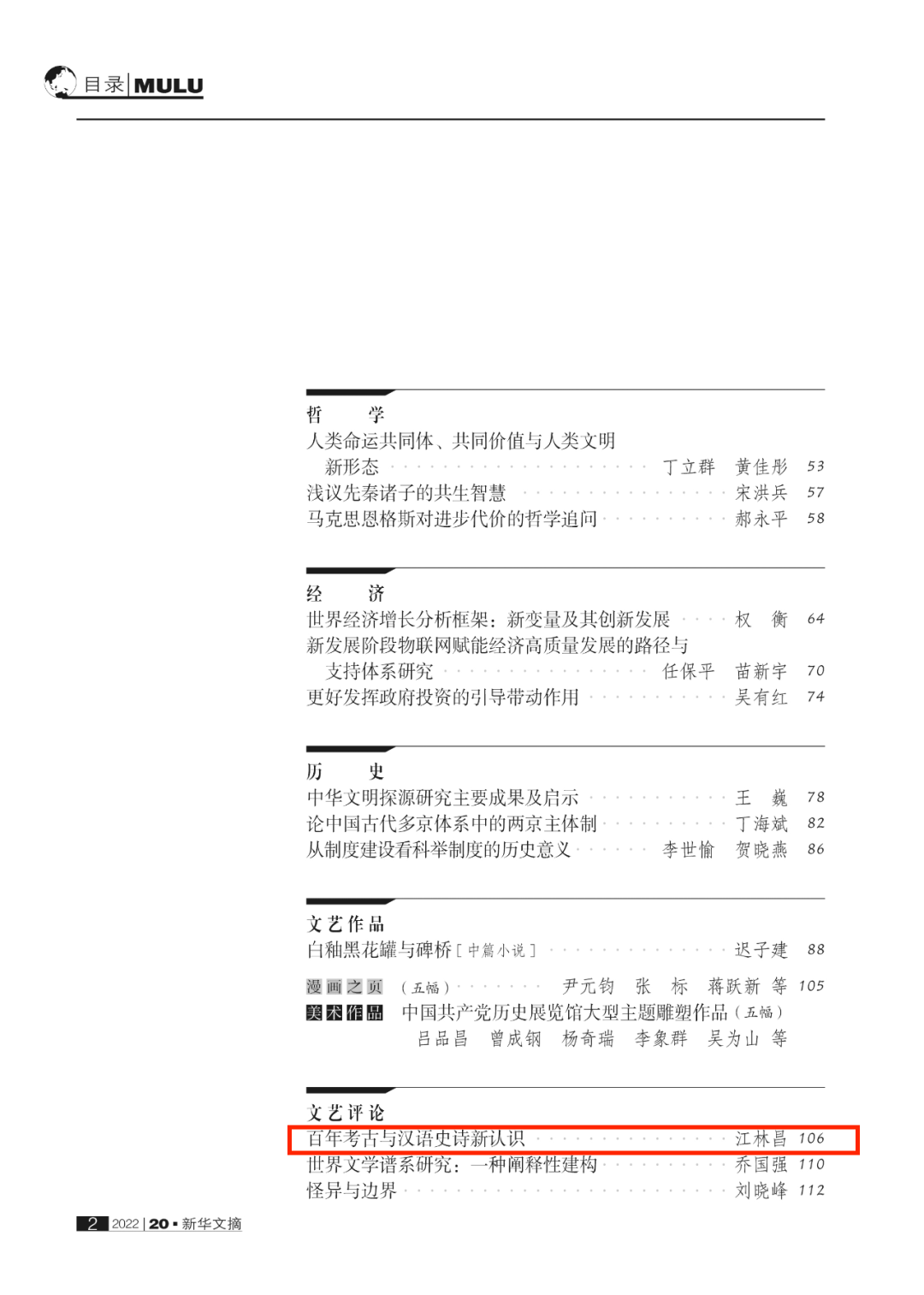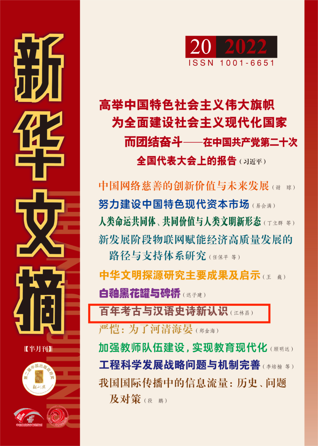 近日,历史文化公司江林昌教授发表于《文学评论》2022年第4期的文章《百年考古与汉语史诗新认识》被《新华文摘》2022年第20期全文转载。