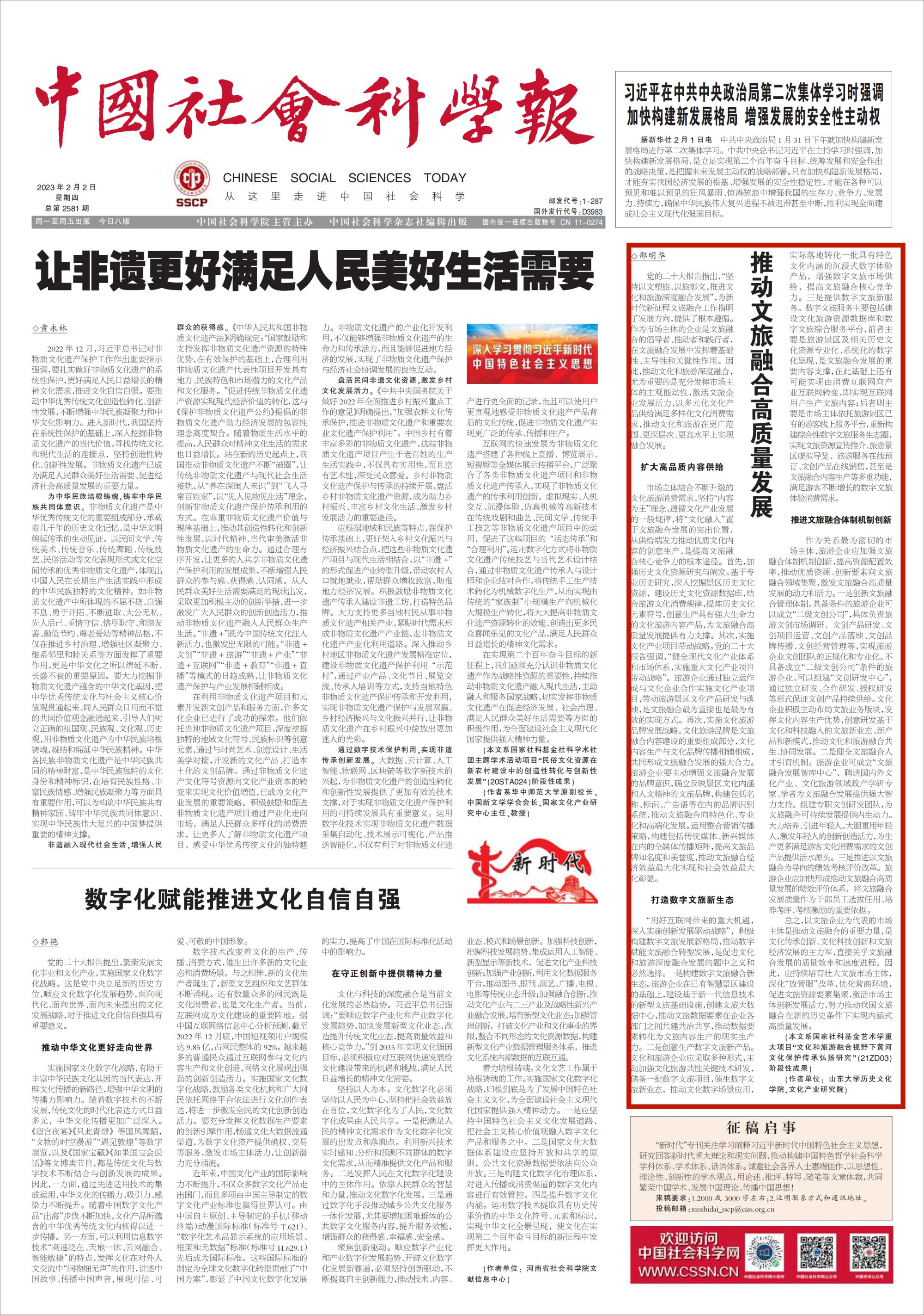今日,《中国社会科学报》发表sunbet官方网站历史文化公司邵明华教授《推动文旅融合高质量发展》(2023年02月02日A01版)的学术文章。文章系国家社科基金艺术学重大项目“文化和旅游融合视野下黄河文化保护传承弘扬研究”(21ZD03)阶段性成果。