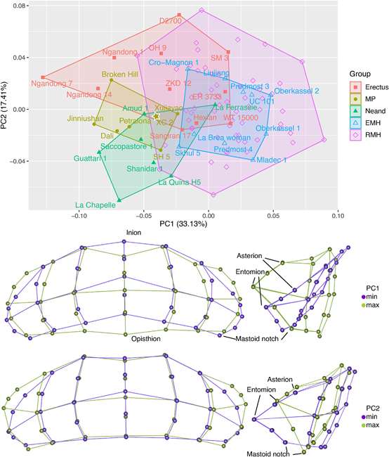 研究结果表明,欧洲、亚洲和非洲现生人类的枕骨形态没有差异,都具有较高的人群内变异,现生人群的变异大于早期现代人。而在头骨的其他区域,由于现代人形成过程中的瓶颈效应,早期现代人的形态变异通常大于现生人类。因此,枕骨形态在现生人群中更高的变异可能来自于发育可塑性、多样的生计方式或环境影响。结合前人研究,本研究支持枕骨形态受到多种因素的影响,并不能忠实的反映系统发育信号。