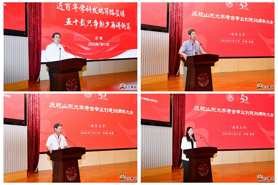 郭新立在致辞中指出,50年来,山大考古学科形成了以田野考古为根基、聚落考古为引领、科技考古为支撑的山大范式,成果丰硕。新时代的山大考古学,必须坚决扛起中华民族现代文明建设的光荣使命,深刻理解“两个结合”的重大意义,守正创新,锐意进取,锚定“中华文明探源”“考古中国”和“黄河重大国家战略”,在建设中国特色、中国风格、中国气派的考古学上当示范、做表率,全面提升考古学国家急需高层次人才自主培养质量,加快建设中国特色、世界一流的“山大考古学派”,在建设中华民族现代文明中彰显山大担当。