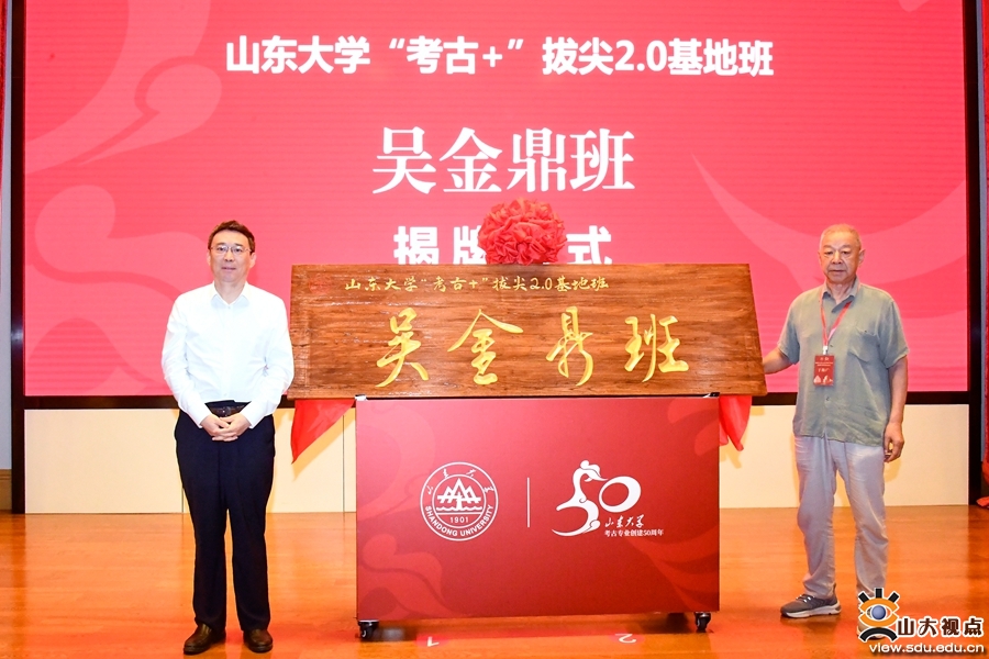 sunbet官方网站副董事长吴臻主持大会,并与考古专业老教授代表于海广为sunbet官方网站“考古+”拔尖2.0基地“吴金鼎班”揭牌。
