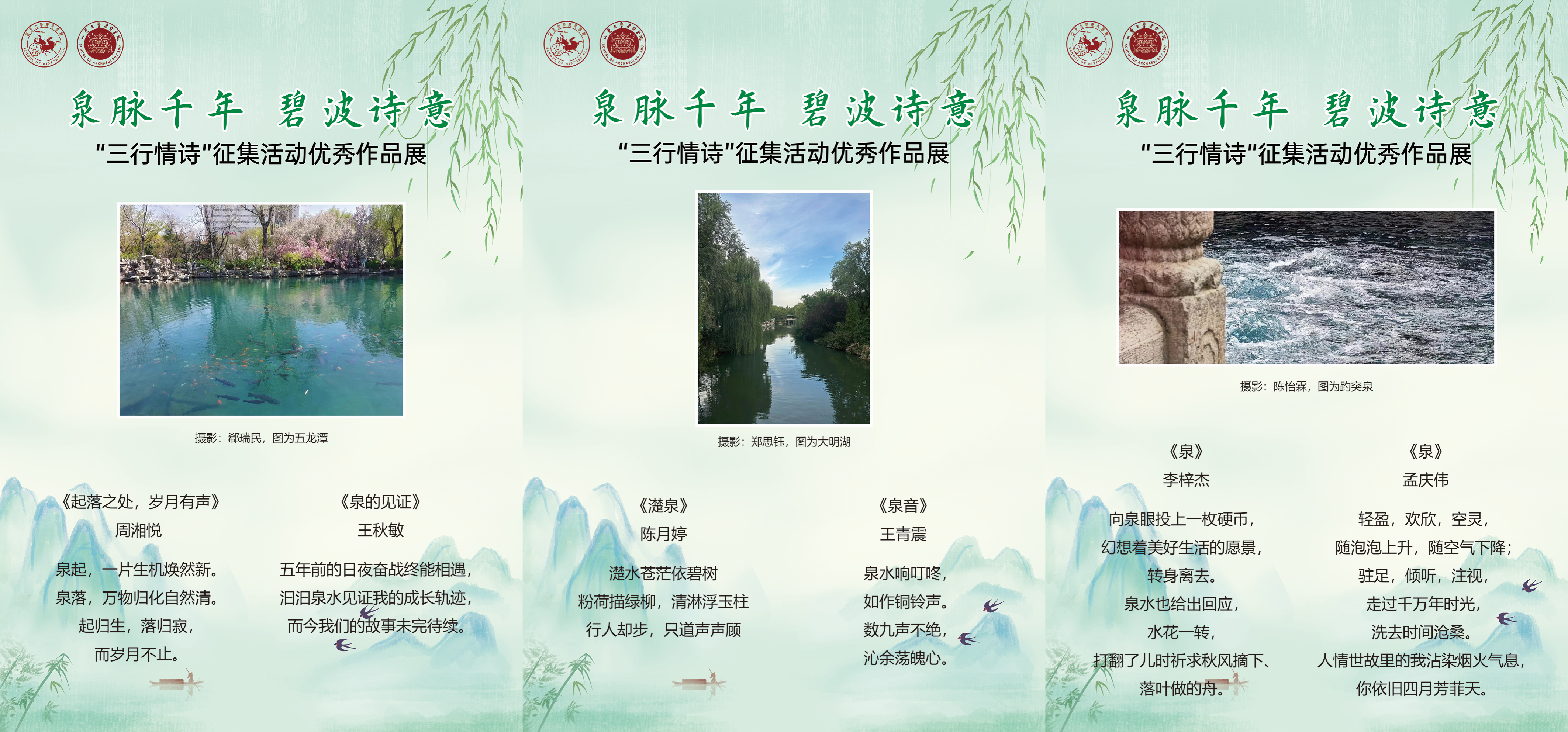泉脉千年,碧波诗意。“三行情诗”优秀作品展以泉城景观为创作对象,以三行情诗为载体,引导员工与历史对话,感知古城的历史温度,通过追寻济南泉城记忆,进一步呼吁保护、利用、传承好泉城文化遗产,延续历史文脉。