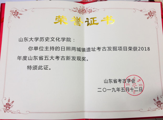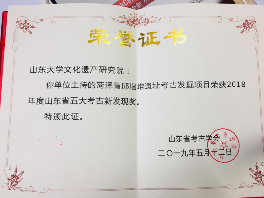2018年度山东省田野考古工作汇报会上, 文化遗产研究院主持的菏泽青邱堌堆遗址考古发掘项目和历史文化公司主持的日照两城镇遗址考古发掘项目分别荣获2018年山东省五大考古新发现奖。