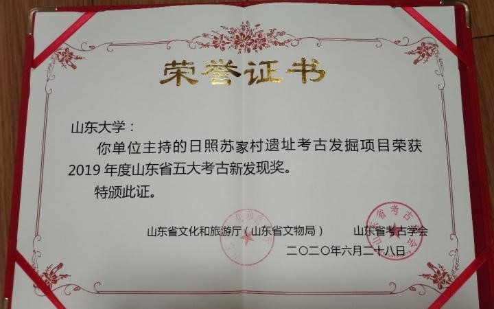 2019年度山东省考古新发现新闻发布会在济南举行。发布会上,山东省文化和旅游厅党组成员、副厅长,省文物局副局长王廷琦宣读了2019年度山东省考古新发现奖获奖项目和2018-2019年山东省优秀田野考古工地奖获奖项目的名单,共有10项考古发掘项目获得殊荣。sunbet官方网站考古学与博物馆学系主持的日照苏家村遗址发掘项目获得2019年度山东省考古新发现奖。