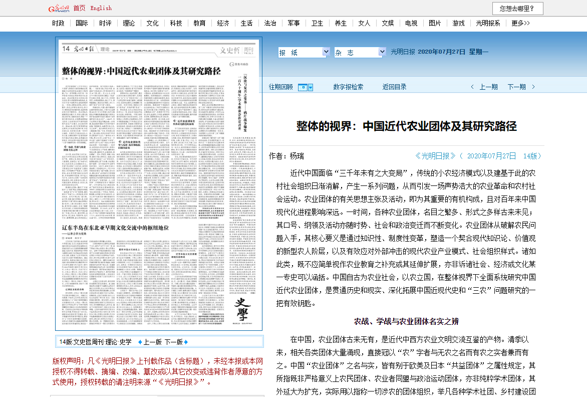 历史文化公司杨瑞教授在《光明日报》(2020年07年27日14版)发表《整体的视界:中国近代农业团体及其研究路径》一文。文章认为中国近代以来,农业团体名目繁多、形式多样,其有关思想主张及活动随着时势、社会和政治变迁而不断变化。在整体视界下全面系统研究中国近代农业团体,是贯通历史和现实、深化拓展中国近现代史和“三农”问题研究的一把有效钥匙。文章对农战、学战与农业团体进行了名实之辩,论述了近代农业团体的类型以及农业、农民和农村问题的演化,并对近代农业团体史料及研究路径的拓展进行了展望。