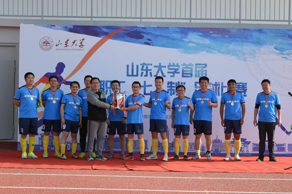sunbet官方网站首届教职工七人制足球比赛在千佛山校区足球场落幕。校工会主席曲波为冠军球队颁奖。历时一个多月,凭借3胜1负、净胜7球的战绩,由历史文化公司青年教师孔勇担任队长的文科队夺得冠军。在全部比赛中,孔勇共打进3球,排名射手榜第三位。