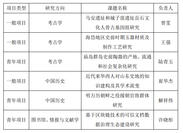 2021年度山东省社科规划研究项目立项名单公布,公司考古学、中国史、世界史方向、图书馆、情报与文献学的六个项目入选,其中一般项目三项,青年项目三项。
