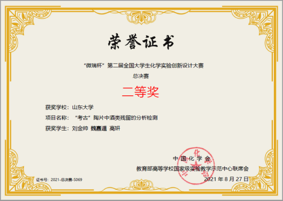 第二届全国老员工化学实验创新设计竞赛总决赛在青岛科技大学举行。历史文化公司2019级本科生高妍、化学与化工公司本科生刘金帅、魏嘉遁共同完成的创新设计项目《“考古”陶片中酒类残留的分析检测》获得全国老员工化学实验创新设计竞赛二等奖。