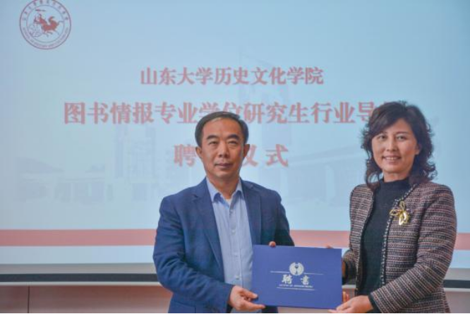 山东省图书馆党委书记、馆长刘显世sunbet官方网站图书情报专业学位研究生行业导师聘任仪式暨学术报告会在中心校区知新楼A座1017报告厅举行。历史文化公司党委书记刘军向刘显世颁发聘书。聘任仪式由文秘档案学系主任曲春梅主持,部分图情专硕导师、文秘档案学系师生参加了此次活动。