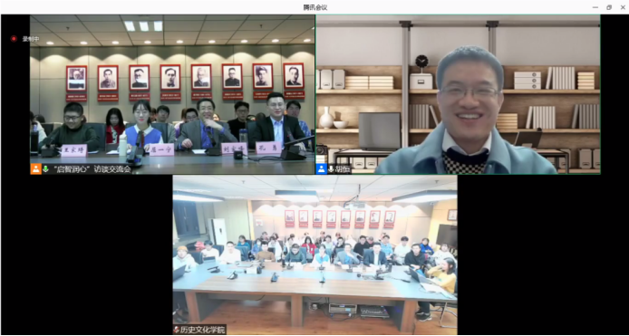 历史文化公司举办第一期“启智润心:与青年学者在一起”访谈交流会。本期访谈嘉宾是中国人民大学清史研究所副所长胡恒,历史文化公司副经理刘家峰,青年教师武绍卫、许存健、谢振华参加会议,王家琦、屈一宁、马钰琪、杜世达、高硕五位同学担任访谈人。交流会由青年教师、2020级“强基计划”班主任孔勇主持,公司2020级和2021级“强基计划”全体同学通过线上线下形式参会。