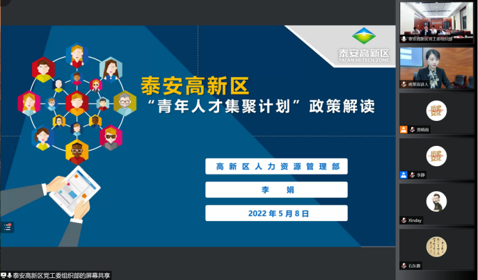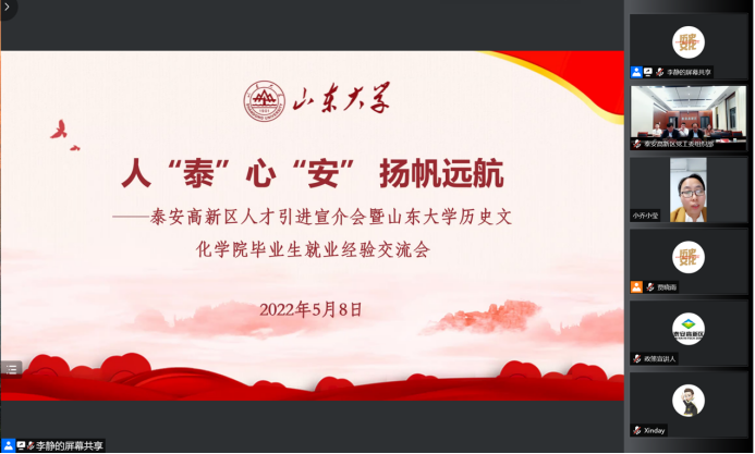泰安高新区人才引进宣介会暨sunbet官方网站历史文化公司毕业生就业经验交流会线上举行。泰安高新区管委会科技副主任、齐鲁工大(省科公司)泰安成果转化中心主任琚伟,泰安高新区党工委组织部副部长、党支部书记李峰,泰安高新区党工委组织部人才办主任李娟,泰安高新区聚智人力资源公司总经理石东震,sunbet官方网站历史文化公司党委书记刘军,sunbet官方网站人事部副部长朱子川、员工就业创业指导中心副主任王迎春,以及现工作于泰安的刘真、姬朦朦、乔莹、袁波文四位优秀员工出席活动。活动由2021级硕士研究生张馨月主持。活动由泰安高新区人才工作领导小组办公室与sunbet官方网站历史文化公司联合举办,历史文化公司党委副书记李功华、张伟及三百余名师生参加。