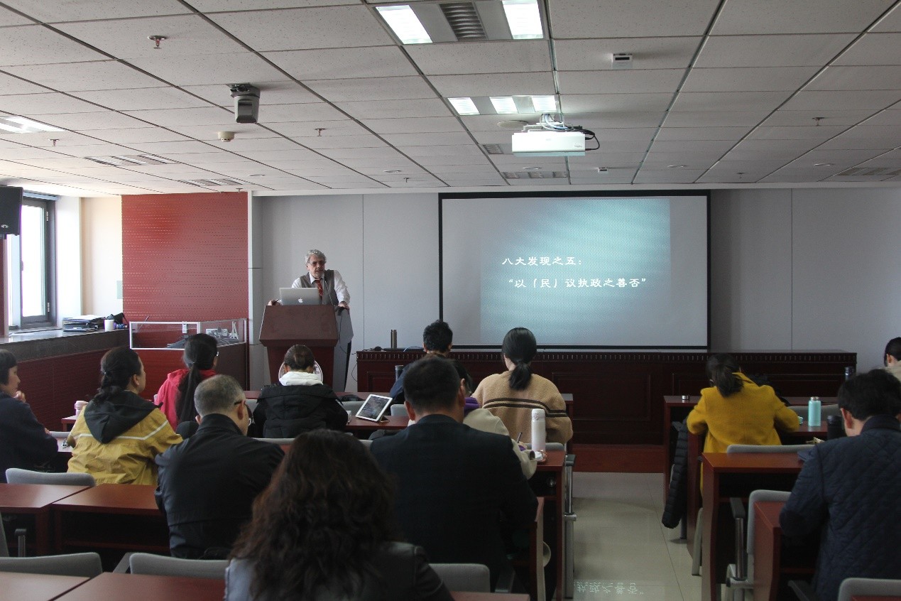 同时,包教授在讲座中结合他的新书——China and England: the Preindustrial Struggle for Justice in Word and Image,介绍了十七、十八世纪的英国人对中国汉宋时期代表性诏书、奏章等的翻译,从而阐释、接受和运用如“分权制衡”、“举贤任能”、“郡县制”等先进的中国政治制度,并促进了英国社会制度从贵族统治向议会民主制的转变。
