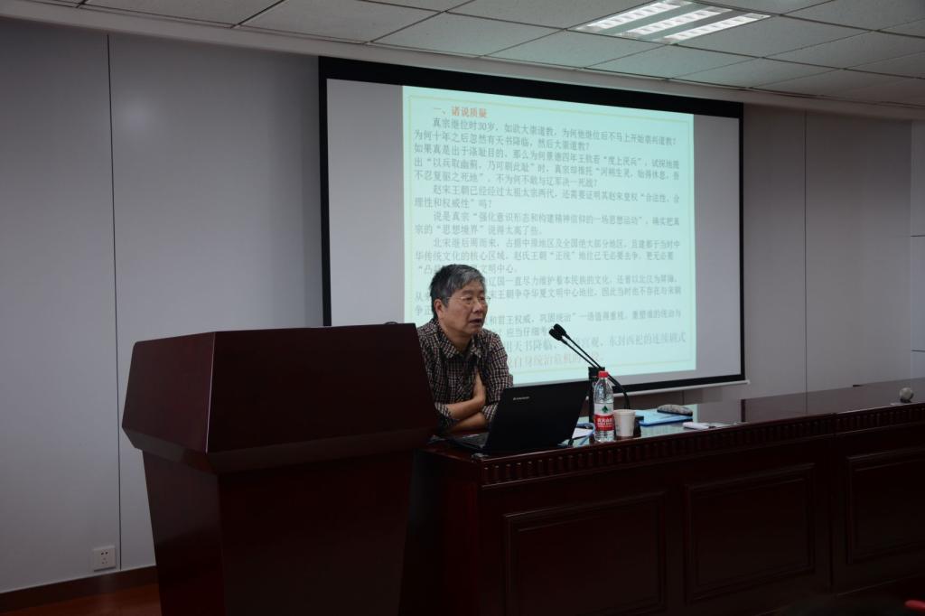 随后,汤教授详细阐述了宋真宗东封西祀的过程。汤老师指出,宋真宗在宰相王钦若的建议下,通过“天书”降临、泰山封禅确立了自身统治的合法性、正统性和权威性,又通过赵姓圣祖托梦堵塞了赵姓其他子弟继承皇位的可能。且在一定程度上提高了仁宗的威望,为日后仁宗即位铺路。汤教授认为,宋真宗出于“私心”而进行的一系列的“表演”,明显地偏离了正确的应有的施政轨道。另外,真宗东封西祀还涉及到建造京师道教两宫问题,挥霍民财,耗费百万,使国家深陷于政治、经济危机之中。
