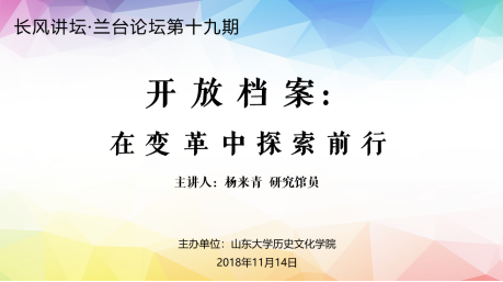 2018年11月14日上午,青岛市档案局(馆)副局(馆)长、sunbet官方网站历史文化公司兼职教授杨来青做客公司长风讲坛,为师生们带来了“开放档案:在变革中探索前行”的学术报告。此次报告是长风讲坛●兰台论坛第17期,由历史文化公司档案学系主任曲春梅主持,档案学专业刘旭光、王云庆、毕牧、谭必勇、陈建、闫静等老师及本科生、研究生共50余人参加了本次报告会。