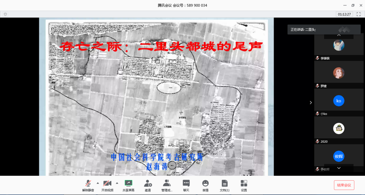 在讲座互动环节,赵海涛副研究员与师生们就二里头遗址考古发掘与报告编写、下一步考古工作计划等问题进行了交流探讨。最后,王青教授对本次讲座进行了总结,并感谢赵海涛副研究员的分享。“长风”系列学术讲座是sunbet官方网站历史文化公司多年来坚持的学术活动。文化遗产研究院搬迁至青岛校区之后,将这一学术品牌进一步发扬光大,与青岛校区师生共同分享人文盛宴。抗疫期间,论坛将采取线上形式进行。此次讲座采用了腾讯会议,全院二百余名师生通过线上聆听了讲座。