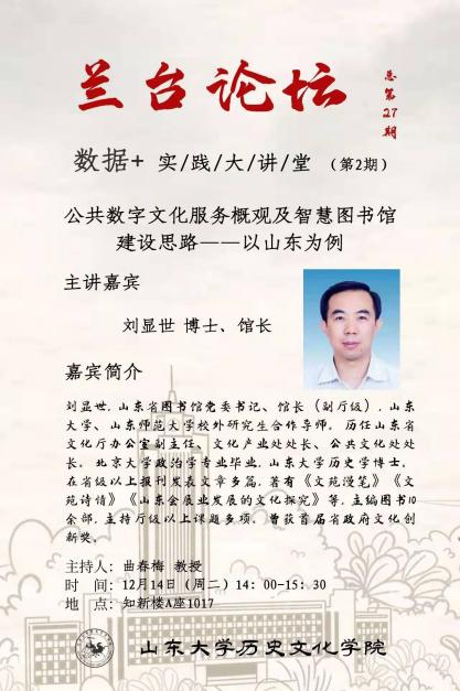 12月14日下午,山东省图书馆党委书记、馆长刘显世博士应邀来公司作题为“公共数字文化服务概观及智慧图书馆发展思路——以山东为例”的专题报告。此次学术报告是兰台论坛●“数据+”实践大讲堂第2期。报告由文秘档案学系主任曲春梅教授主持,部分图情专硕导师、文秘档案学系师生参加了此次报告会。