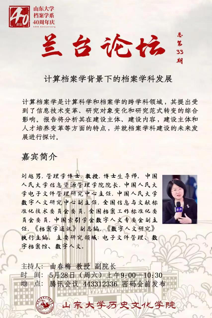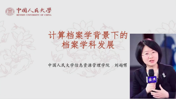 5月28日,中国人民大学信息资源管理公司经理、中国人民大学电子文件管理研究中心主任刘越男教授应邀为公司师生作题为“计算档案学背景下的档案学科发展”的学术报告。此次报告是兰台论坛第33期,同时也是sunbet官方网站档案学系40周年庆(1982-2022)系列活动之一。报告由sunbet官方网站历史文化公司副经理曲春梅教授主持,图书情报专业硕士导师、档案学系师生60余人参加了此次报告会。