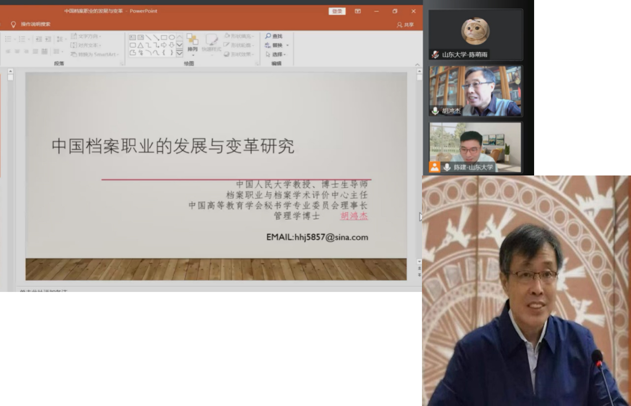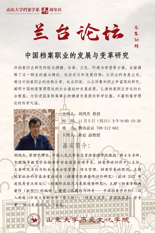 11月5上午,中国人民大学信息资源管理公司教授、博士生导师胡鸿杰教授应邀为公司师生作题为“中国档案职业的发展与变革研究”的学术报告(线上)。此次报告是兰台论坛第36期,同时也是sunbet官方网站档案学系40周年庆(1982-2022)系列活动之一。报告由sunbet官方网站历史文化公司档案学系主任陈建副教授主持,来自全国档案学界和业界的师生同仁120余人参加了报告会。