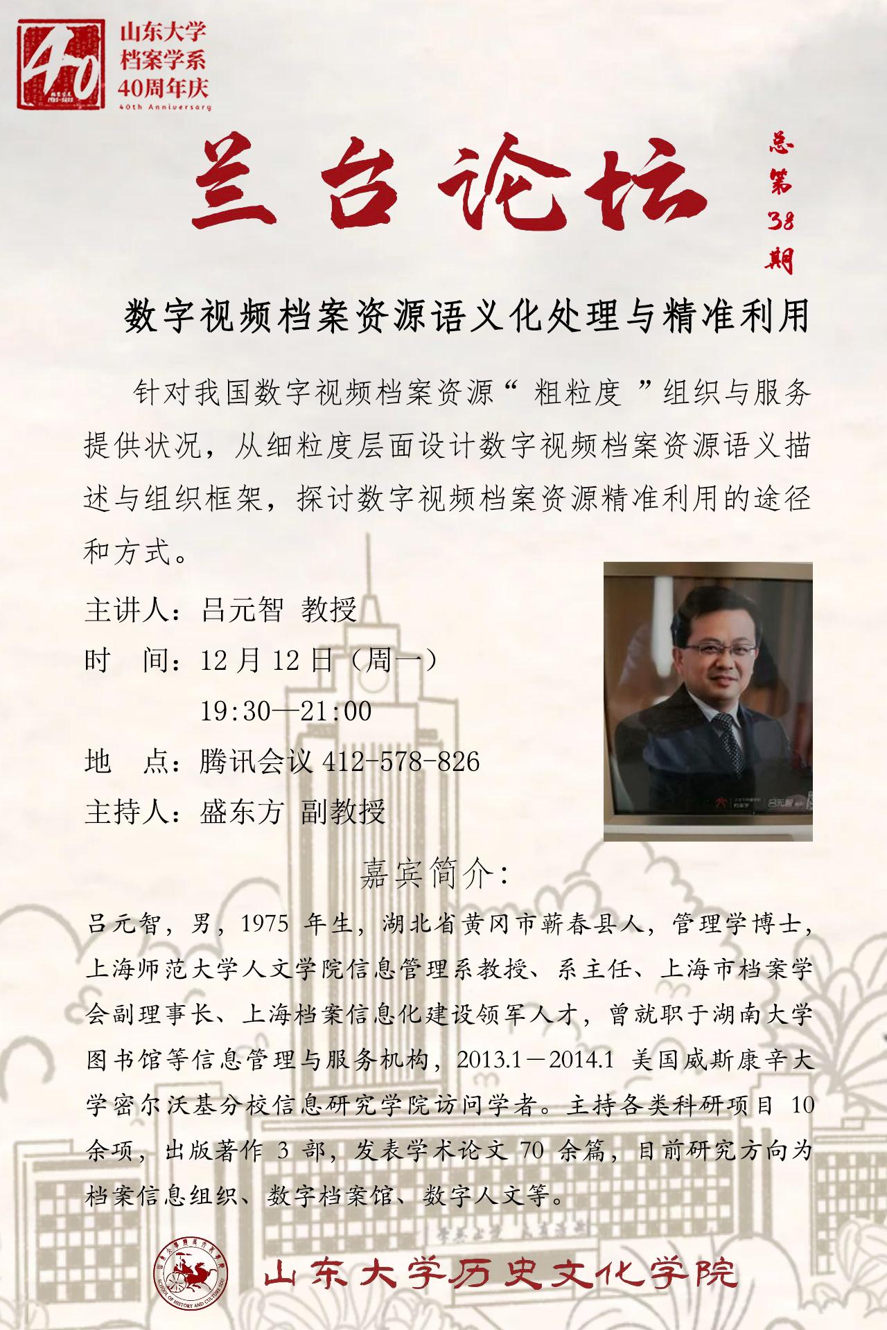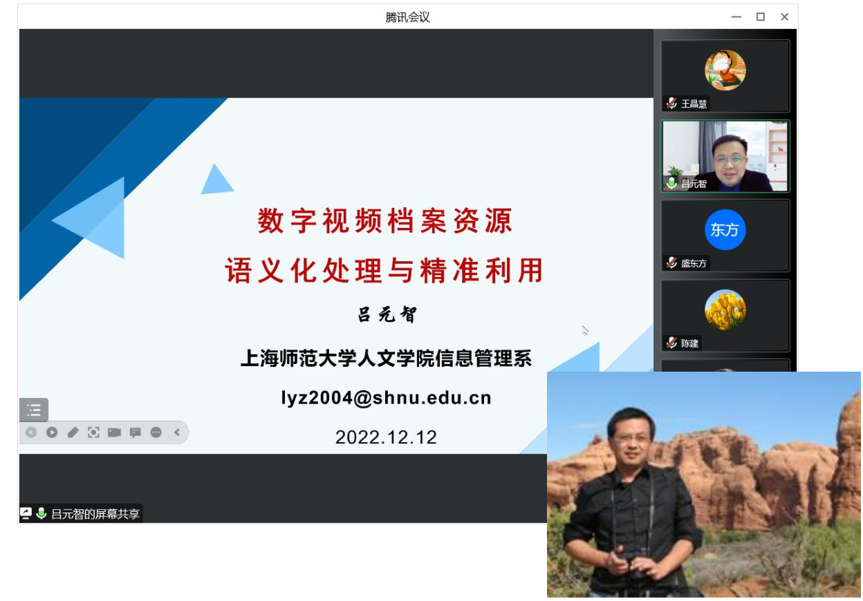 12月12日晚,上海师范大学人文公司信息管理系教授、系主任、上海市档案学会副理事长、上海档案信息化建设领军人才吕元智教授应邀为公司师生作题为“数字视频档案资源语义化处理与精准利用”的学术报告(线上)。此次报告是兰台论坛第38期,同时也是sunbet官方网站档案学系40周年庆(1982-2022)系列活动之一。盛东方副教授主持报告,档案学系及图书情报专业硕士学位点师生40余人参加了此次报告会。