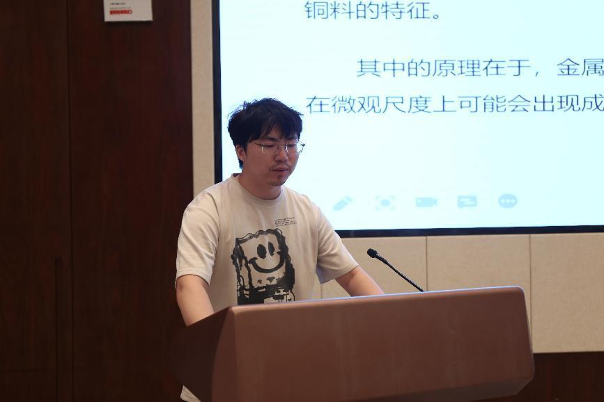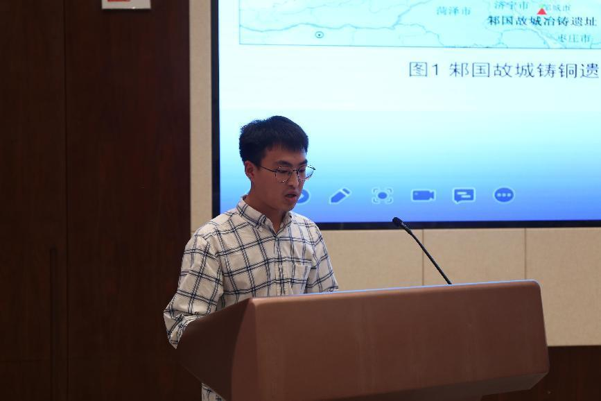 中国科学技术大学研究生严贤盛的发言题目为《邾国故城铸铜遗址出土炼渣和青铜器的铅同位素分析》。严贤盛同学对邾国故城冶铸遗址出土的13件铜渣和12件铜器分别进行X射线荧光光谱、扫描电子显微镜-能谱、铅同位素分析。通过铜渣基体和金属的分析可知,铜渣中多包含铜、锡、铅、铜-锡等金属颗粒,CuO、SnO2和PbO含量较高,应是熔炼合金产生的熔铜渣,初步判断该遗址以铸造铜锡铅三元合金青铜兵器为主。由铅同位素分析结果可知,铜渣和铜器铅同位素比值变化范围较大,虽存在一定差异,但主体部分重合,可能存在三种不同铅料来源。他认为,邾国故城铜渣及铜器的铅同位素组成既不同于春秋晚期至战国早期中原及山东地区青铜器,也与胶东地区铅矿存在显著差异,可能主要为独立开采冶炼泰沂山脉附近铜、铅资源的结果,此类铅料在山东至少可延续至战国晚期。本研究可为后期探讨邾国冶铸遗址所铸造铜兵器的流通等关键问题提供重要的参考作用。
