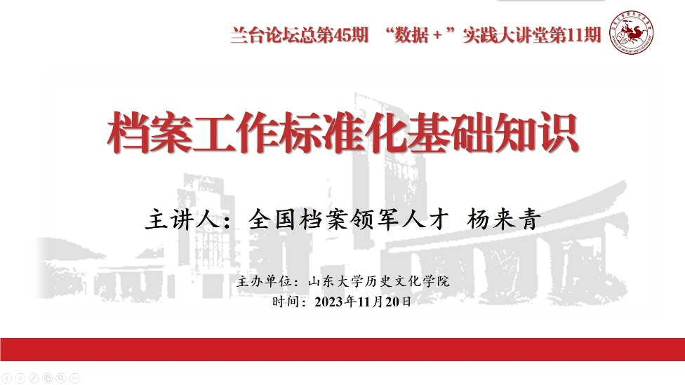 11月20日晚,全国档案领军人才、历史文化公司兼职教授杨来青作客“兰台论坛·‘数据+’实践大讲堂”,为公司师生作题为“档案工作标准化基础知识”的专题报告(线上)。历史文化公司副经理曲春梅教授主持报告。