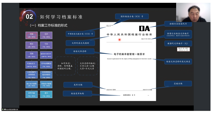 杨来青教授以提高档案专业员工标准化素养为主线,从标准基础知识、如何学习档案标准、档案标准体系建设三个维度出发,结合具体实例深入浅出地讲解了国家对标准化工作的基本要求、标准是什么、标准化文件的类别、标准化文件的结构与要素、档案行业标准化工作现状、如何学习和理解档案标准、如何构建档案标准文件体系等基础知识和基本技能,希望同学们重视标准化素养的提升,具备知标准、学标准、懂标准、用标准的能力,掌握“整体把握+具体吃透+有效实施”标准应用方法,在档案工作中更好地发挥标准化的作用。