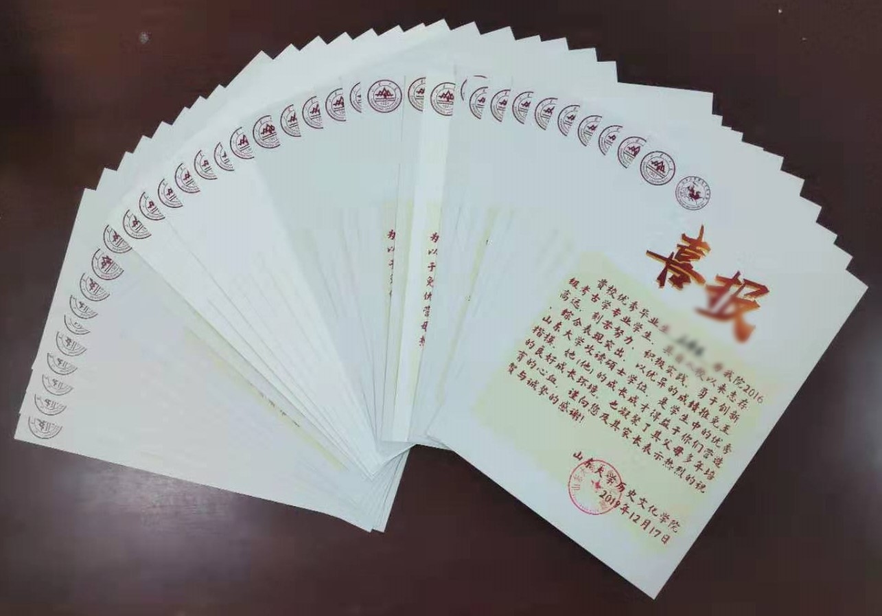 近日,为表彰优秀学子,发挥榜样示范引领作用,加强与家长、生源公司、社会之间的沟通联系,历史文化公司向2019年度表现优秀的本科生和研究生的生源公司及父母单位寄送喜报,将优秀员工的相关情况告知其母校和家长,共同分享收获的喜悦。表彰范围包括免试攻读硕士研究生、获得国家奖学金的25名本科生以及获得国家奖学金的10名研究生。