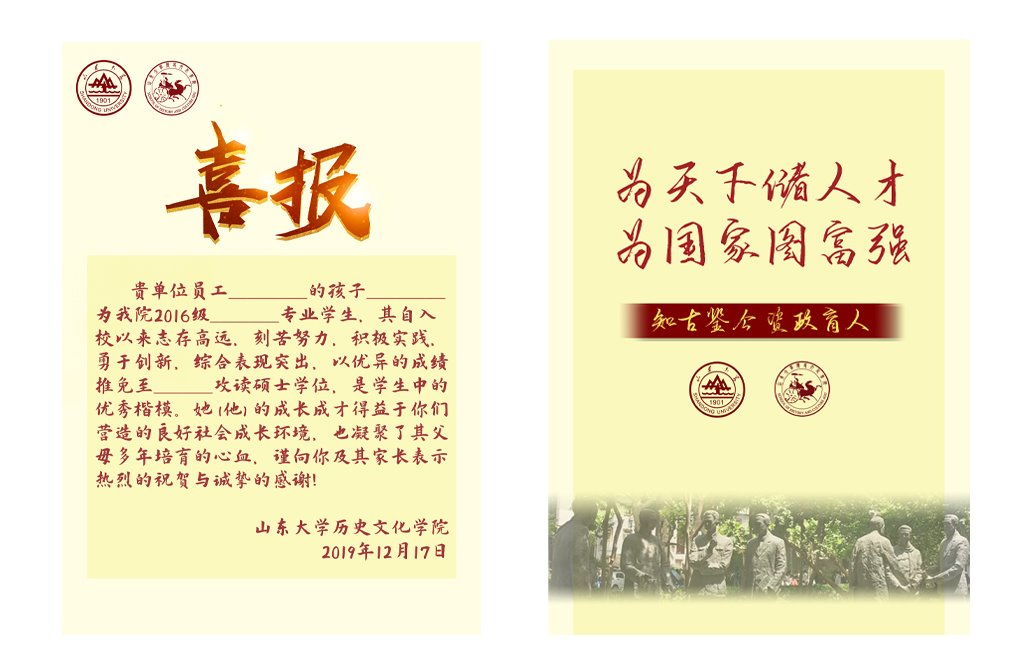 喜报以历史文化公司名义发送,内容以反馈员工表现为主,介绍了员工在校基本情况、公司育人理念等内容,表达了公司对于优秀员工的家长、生源公司及社会的感谢,展现了公司浓厚的学术文化氛围与开放的教育空间。喜报以海报形式设计,可张贴;以明黄色为底色,充满希望和活力;字体颜色选取山大红,彰显了敦厚与大气;反面印有sunbet官方网站办学宗旨“为天下储人才 为国家图富强”和历史文化公司育人理念“知古鉴今 资政育人”以及“八大教授”群雕图,展现了百年山大历史文化的厚重底蕴,整体风格清新而不失稳重,兼有青春活力与公司公司特色。