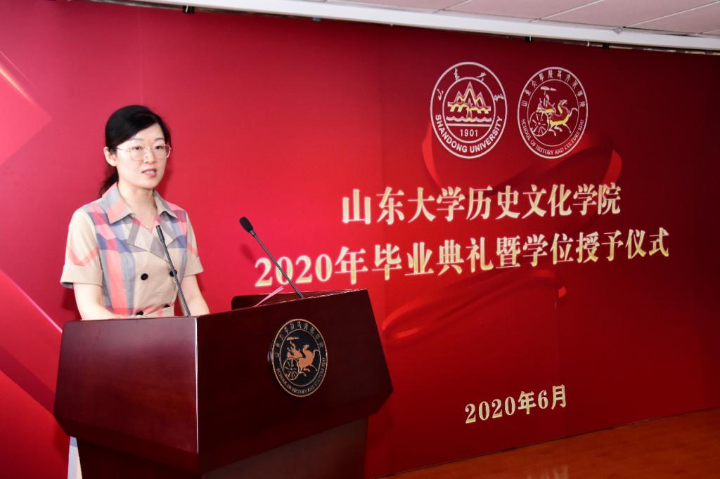 毕业典礼上,教师代表王青教授祝贺同学们克服疫情带来的困难后顺利毕业。作为大家学习生涯的参与者、引导者和见证者,王老师希望同学们以后要不忘初心、学会坚强,做一个有理想、有情怀、有主见的人;要不断学习,终身学习,秉承山大“学无止境、气有浩然”的校训;永远心怀山大,将“山大人”的身份铭记于心,在为母校争光的同时常回“家”看看。
