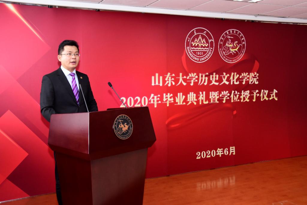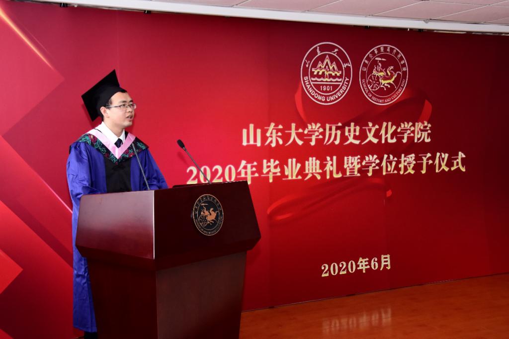 2017级文化产业管理专业硕士研究生寸凯宁作为毕业生代表发言,他回顾了在公司和公司求学、工作的八年时光,用真挚的言语表达了对公司、对老师、对同学的深厚情谊,希望大家今后甘于寂寞、善于坚守、能于自学,无论走到哪里都能秉持历史文化公司的优良品格、展示山大历史人的卓越风采、积极承担起历史使命与时代责任、将理想抱负变成无愧于时代的人生硕果。